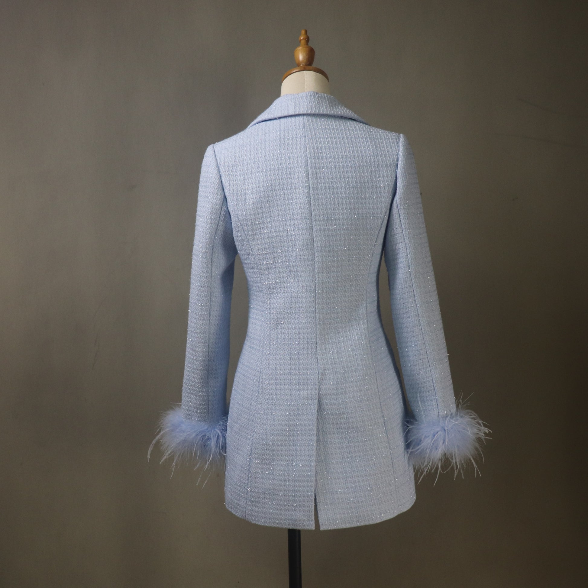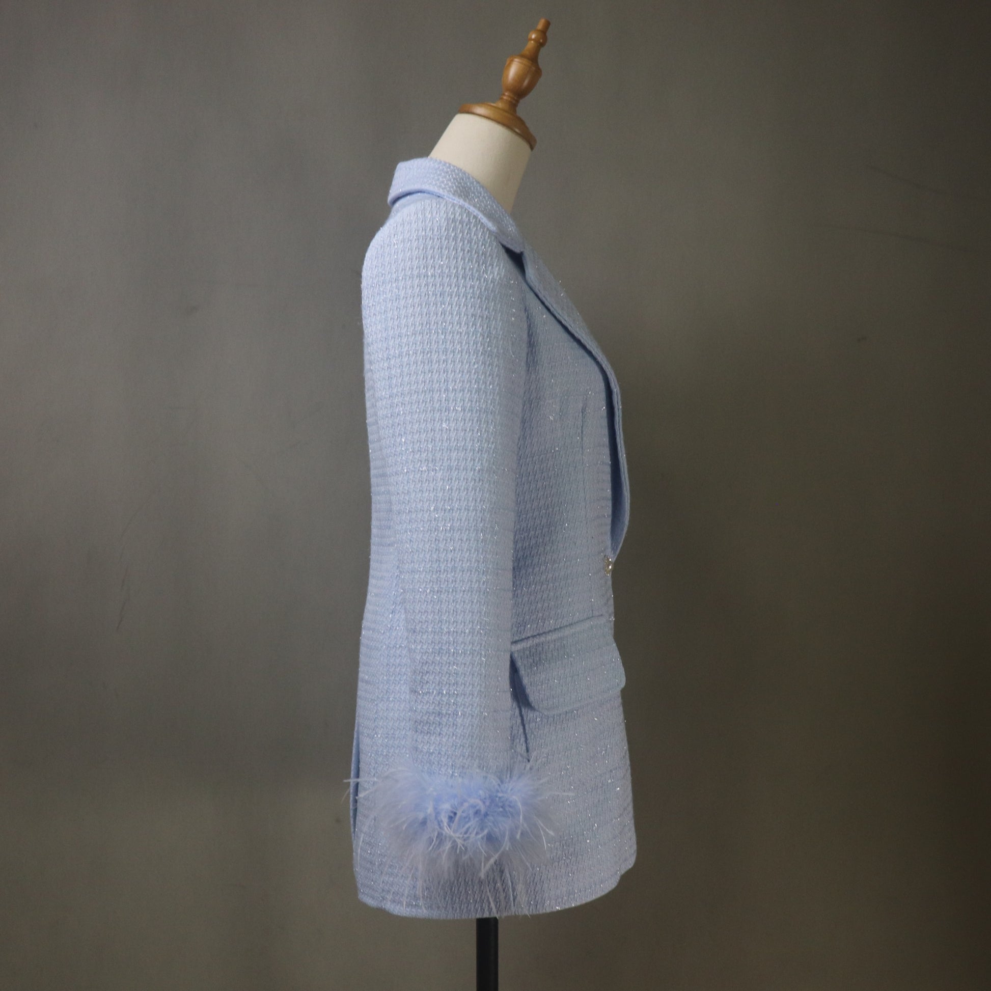This Custom Made Blue Tweed Suit Set is a luxurious, made-to-measure two-piece outfit featuring a chic blazer jacket and mini Skort / skirt, exquisitely finished with soft feather trim cuffs. Perfect for special occasions like bridal showers, custom wedding guest attire, or high-end business events. Since each order is tailored to your precise body measurements, you are guaranteed an impeccable, personalized fit.