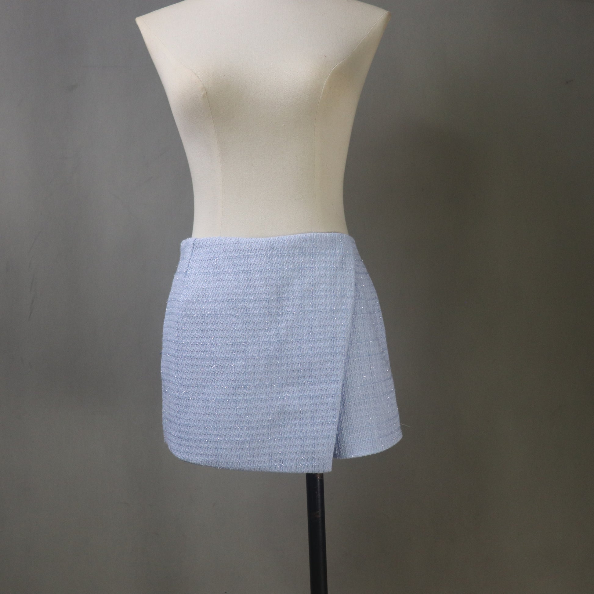 Fabric & Color: Premium light blue polyester tweed material.