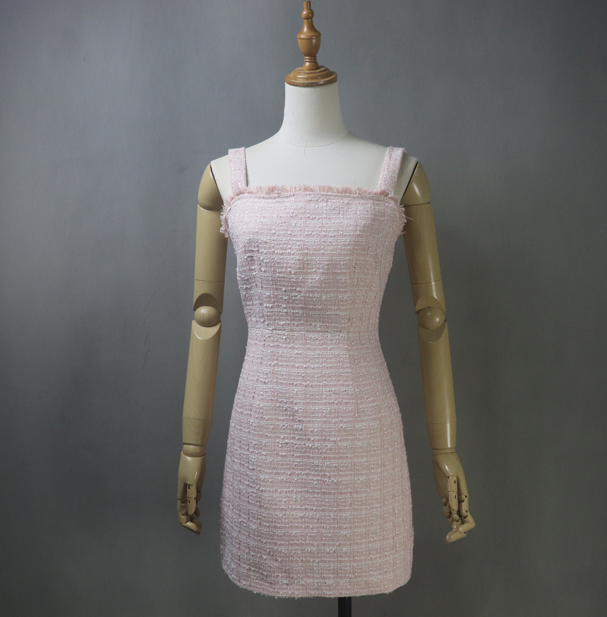 Fabric: Premium-quality pink tweed with subtle shimmer and a soft textured finish.