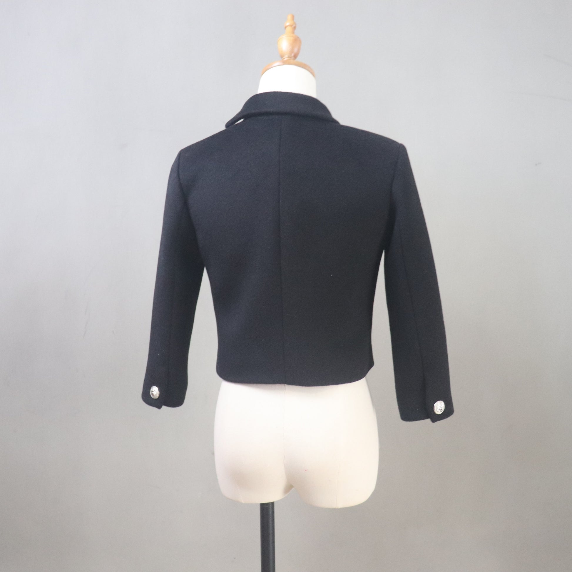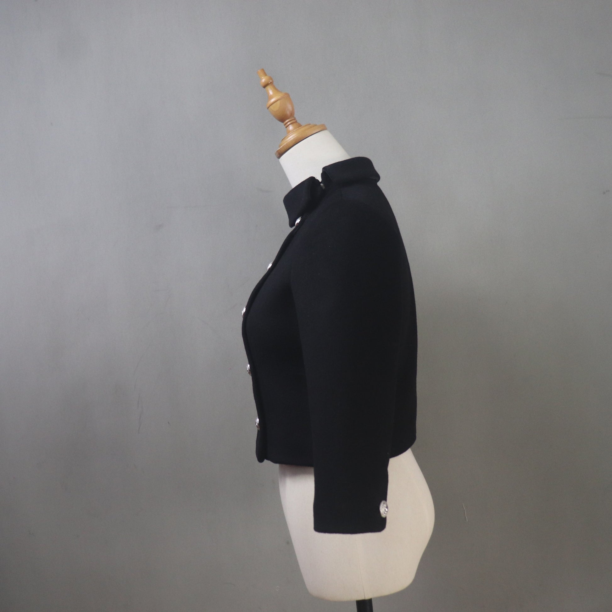 Elevate your wardrobe with this exquisite custom-made jacket, blending timeless vintage elegance with modern edge. Crafted with a sleek, structured silhouette, this cropped black jacket features a distinctive stand-up Nehru collar and a unique side-button closure. The centerpiece of the design is the row of intricate silver-tone ornate buttons, giving it a regal, military-inspired look reminiscent of 19th-century Victorian styles or 1960s "Mod" fashion.