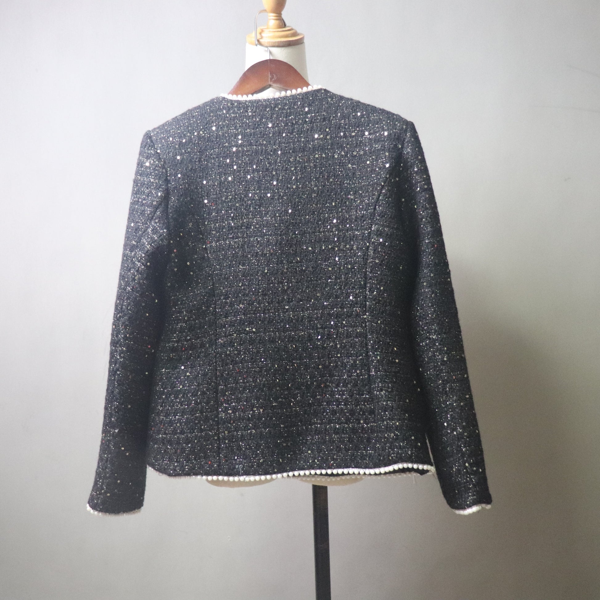 Attention to Detail: Featuring premium tweed fabric, delicate fringe detailing, and ornate jewel buttons.