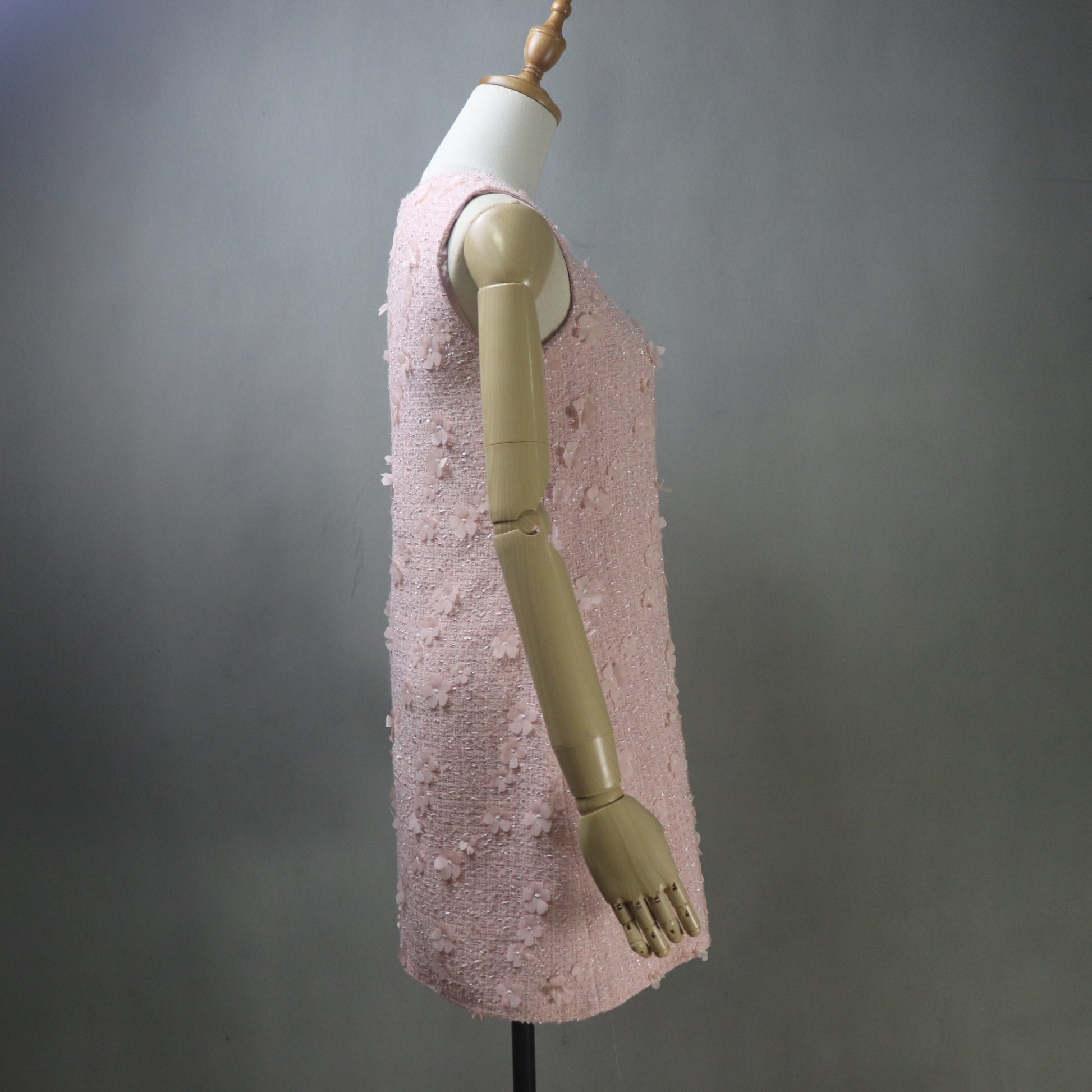 Light Pink Tweed Dress with 3D Flower Embellishments – Custom Made Mini to Midi Dress, long sleeves, Plus Sizes