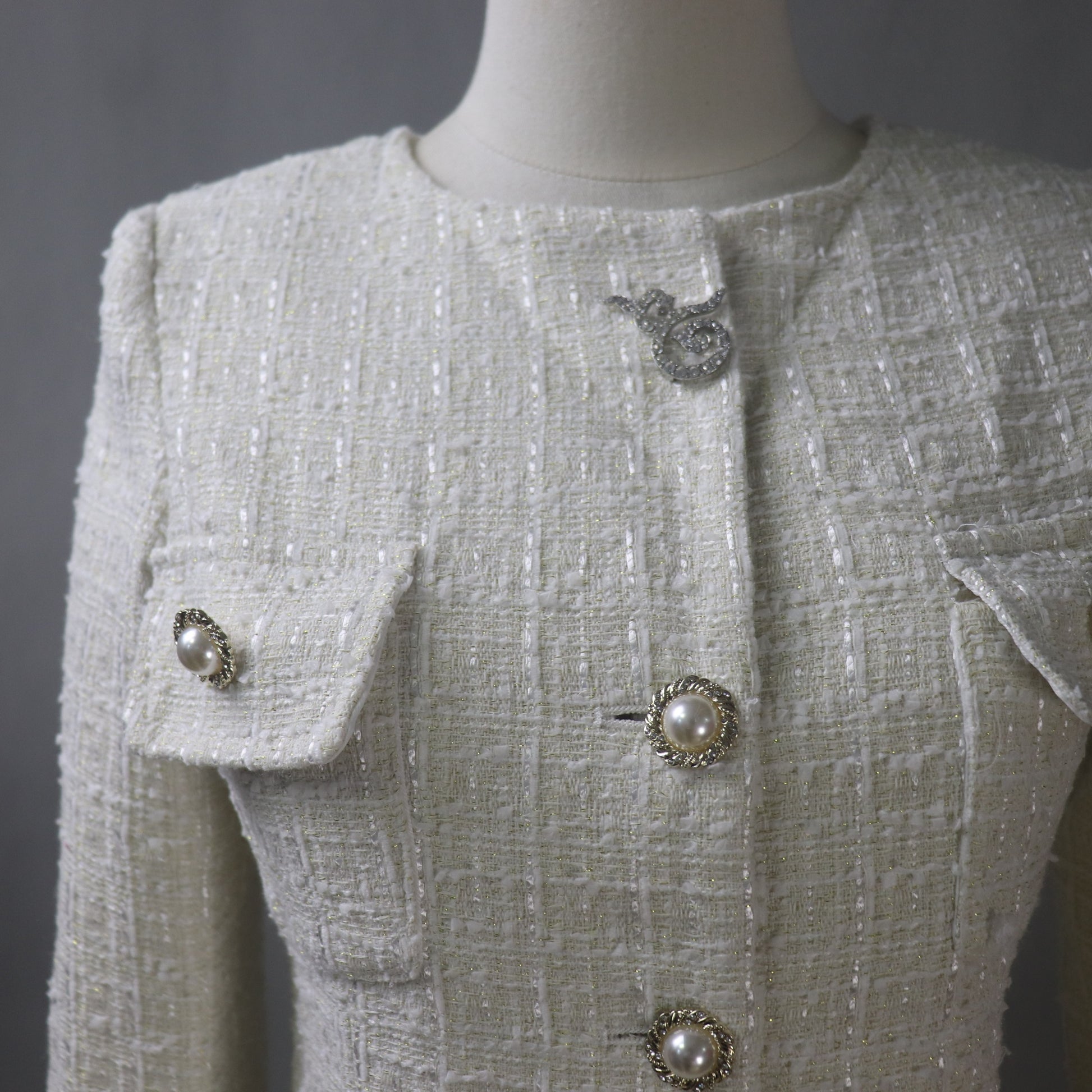 Experience the luxury of a perfect fit with our stunning Custom Made White Tweed Coat. This elegant piece is handcrafted to your exact specifications, offering true slow fashion luxury that is both warm and chic. Say goodbye to standard sizing and embrace a coat designed just for you!