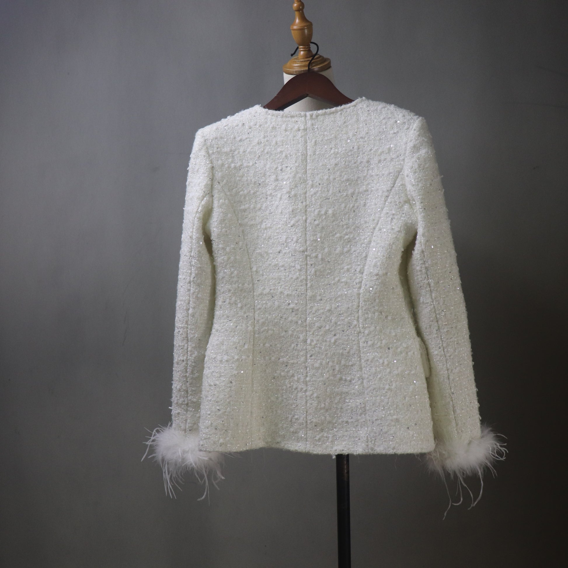 White Tweed Skirt Suit: Feather Cuffs, Sequin Jacket, Custom Fit